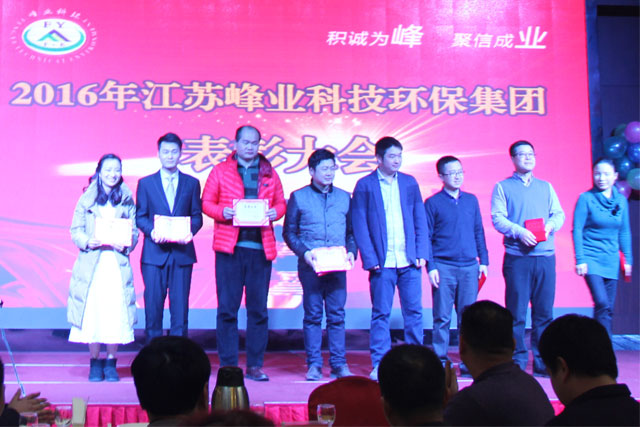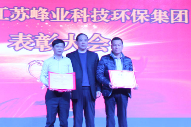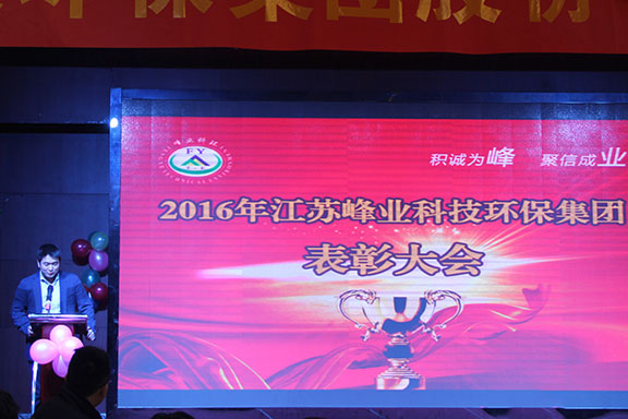 当日下午15:18分江苏峰业集团公司2015年度表彰大会正式开始,由董秘兼集团副总裁王飞主持会议,会议上由总裁助理许峰,子公司副总裁王斌、朱军武,总工王文选,设计部经理杨宝成等就2015年度工作发表感言,由董事长总裁许德富作总结,会上许总发表了热情洋溢的演讲,他表示在2015年严峻的市场形势下,公司顺利完成了预期目标,对支持峰业发展的各位朋友表示诚挚的谢意!向兢兢业业辛勤工作在公司各条战线上的每一位峰业人表示衷心的感谢!许总回顾总结了2015年的峰业发展历程和取得累累硕果,并展望了充满希望的2016年。前途是光明的,道路是曲折的。希望全体员工在新的一年里,齐心努力,再创辉煌,共同迎接更美好的明天!