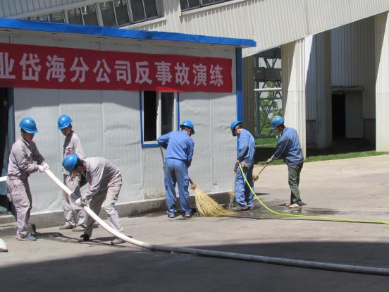 10时40分,随着内蒙峰业公司经理华东一声演习开始的命令,各参加演习人员在模拟机组在满负荷运行工况,循环泵、GGH等设备在DCS画面显示运行正常,运行巡检在例行巡视检查中,发现吸收塔地坑泵出力不足,伴随着液位计失灵的的情况下,从开始汇报到安装潜水泵及排除地坑高位浆液仅用十分钟就使浆液排放到制备泵房地坑。同时在演习过程中出现了一段小插曲,就是在排浆过程中,由于水带长时间搁置,使其产生不少漏点,参加演习人员在经理华东的指挥下迅速使用塑料布进行包裹,这一举动使本次演习更加逼真,并超出了预期效果。在最后的演练评估中,我内蒙峰业本次演练得到岱电各位参加领导极高的总体评价,王振华总工程师也对于此次演练中存在着对讲机配备不足的缺点给予指正。