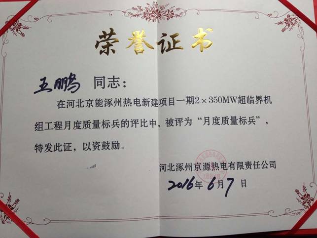 涿州项目部三名同志获得业主“月度质量标兵”荣誉表彰